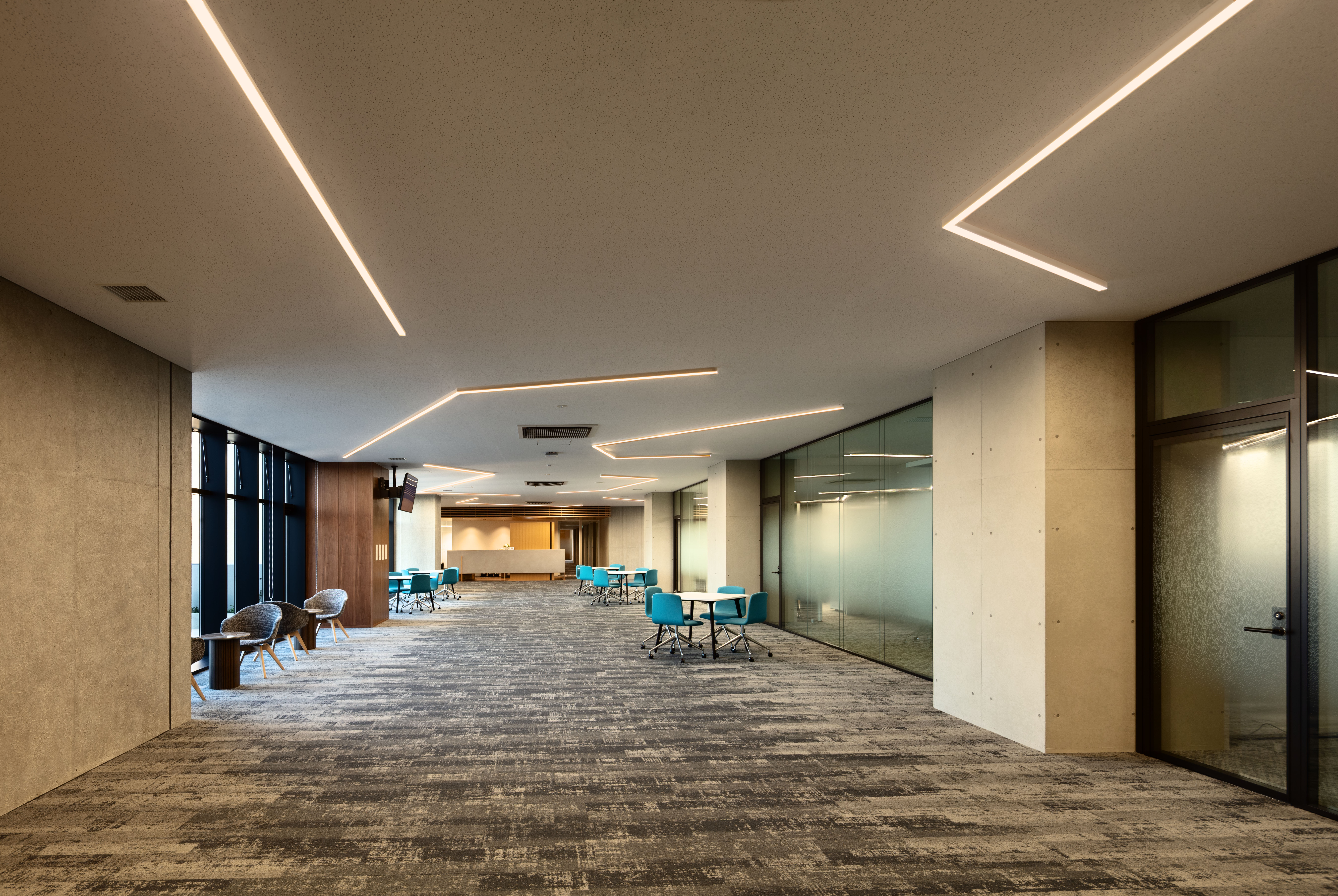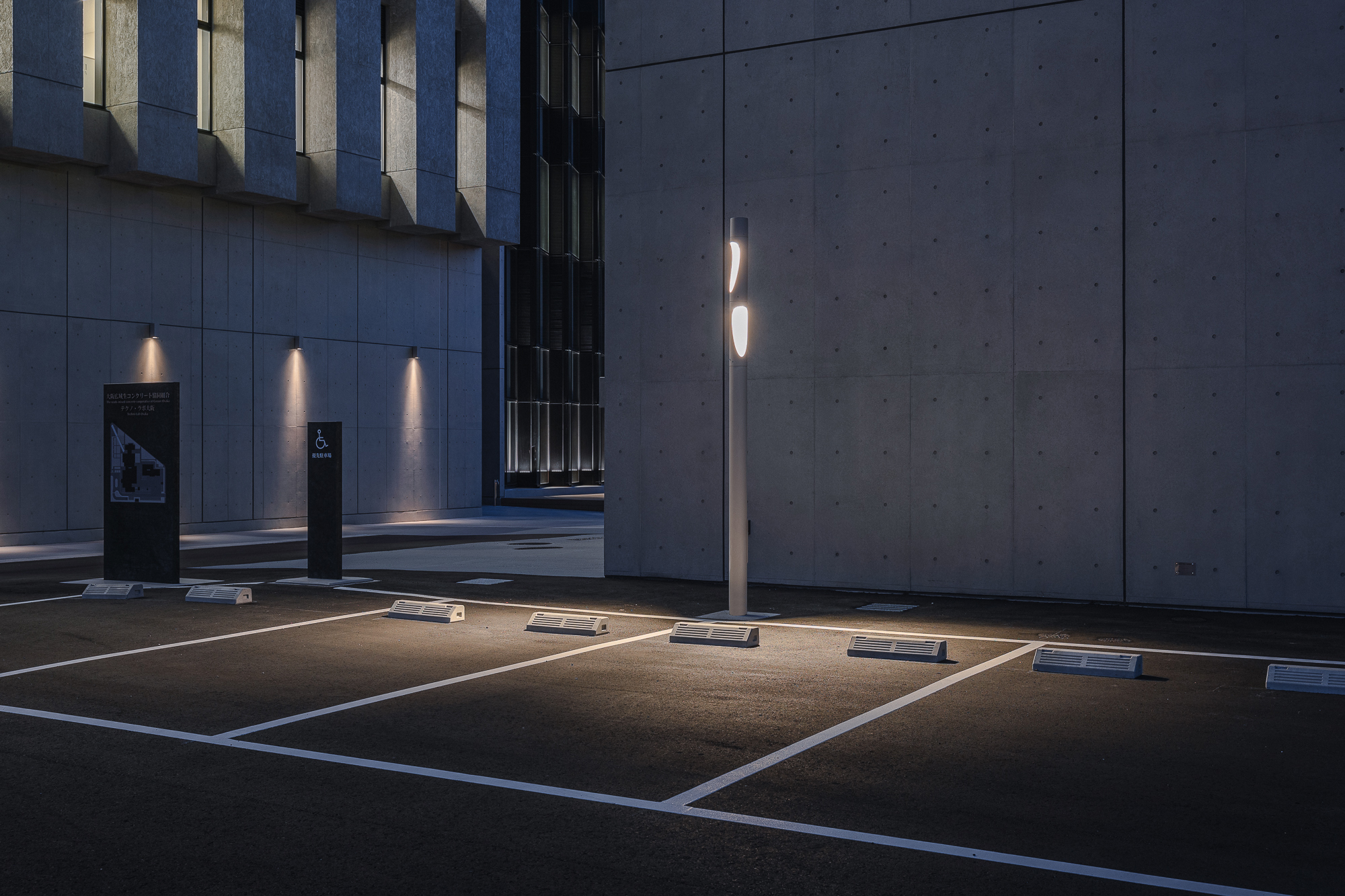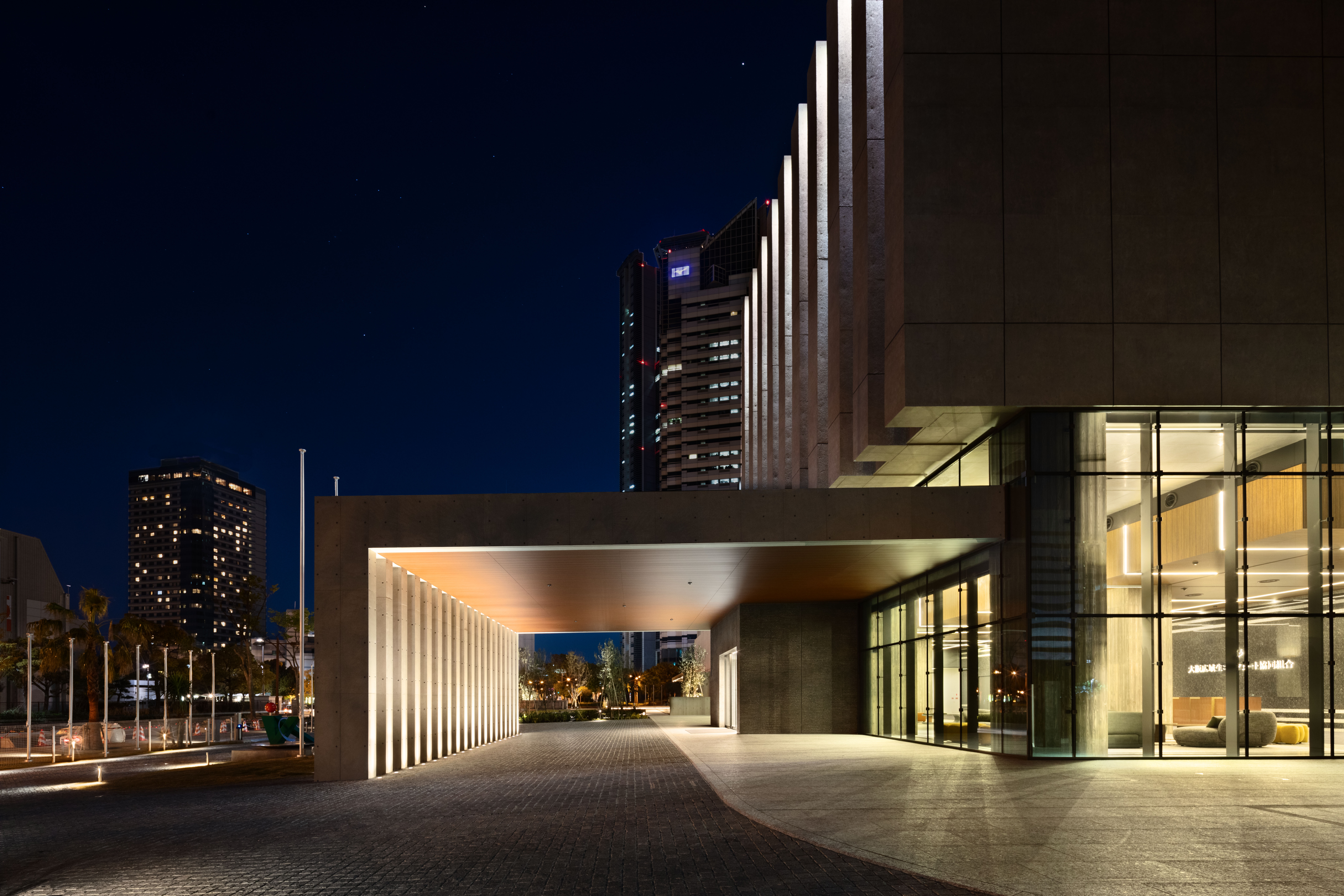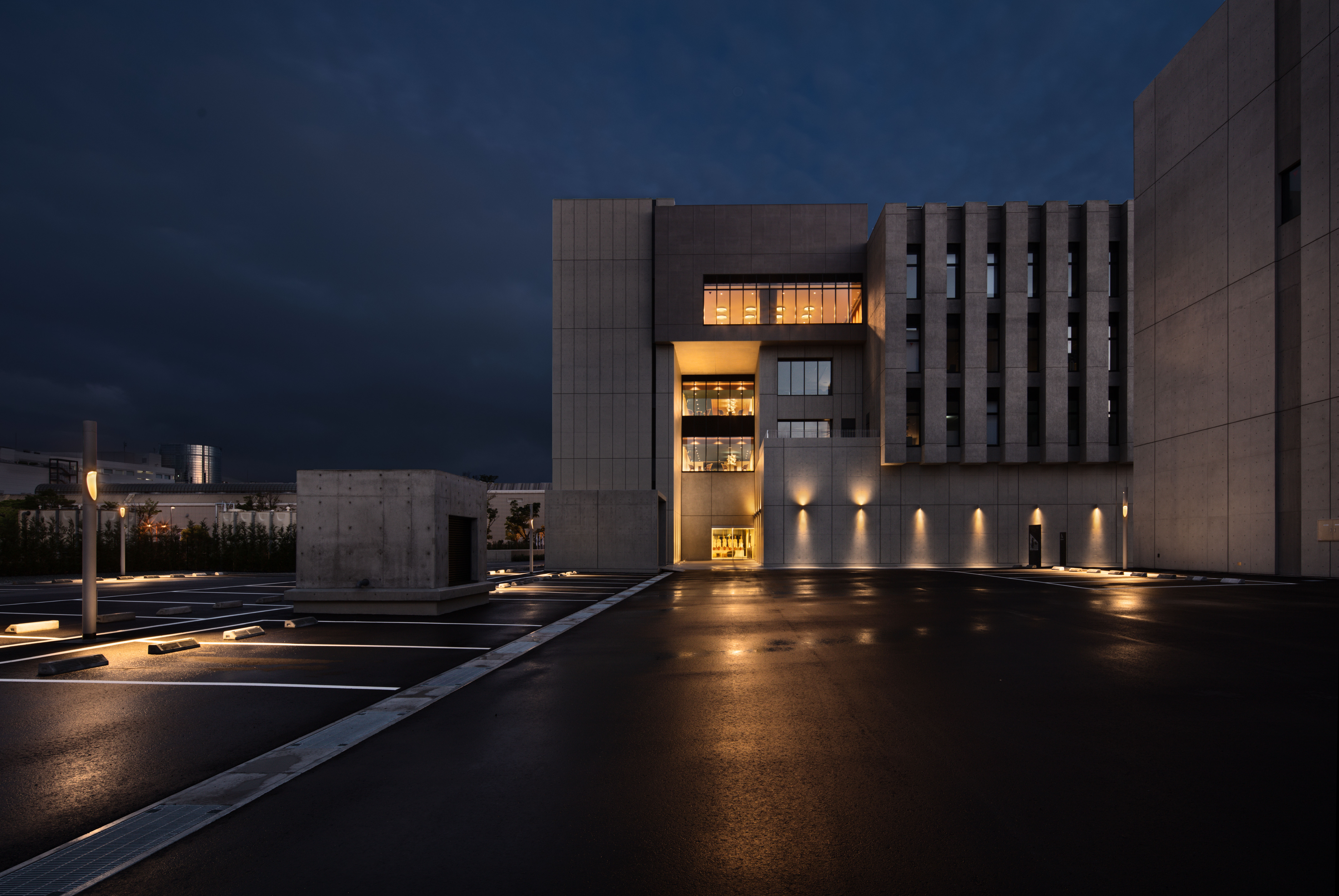 全国で300以上ある生コンクリート協同組合の中で最大規模を誇る、大阪広域生コンクリート協同組合。近畿一円に広く生コンを共同販売する同組合は、新たな本部オフィスおよび研究開発拠点として「テクノ・ラボ大阪」を新設、2025年3月に工事が完了、4月から通常営業を開始しました。梓設計様による施設建物は、同組合のほか関係団体が入居する事務所棟と、産官学が連携して生コンの最先端技術を研究開発する研究棟が一体となった構造で、生コン業界のシンボルとなる意匠と機能を実現しています。YAMAGIWAは、照明計画を担当したAZU設計工房様と協働、緻密な現場フォローにより、パブリックエリアだけでなく、ファサードのフルカラーライトアップ、事務所棟のオフィスライティングなど、外構を含め全エリアに照明器具を納入しています。