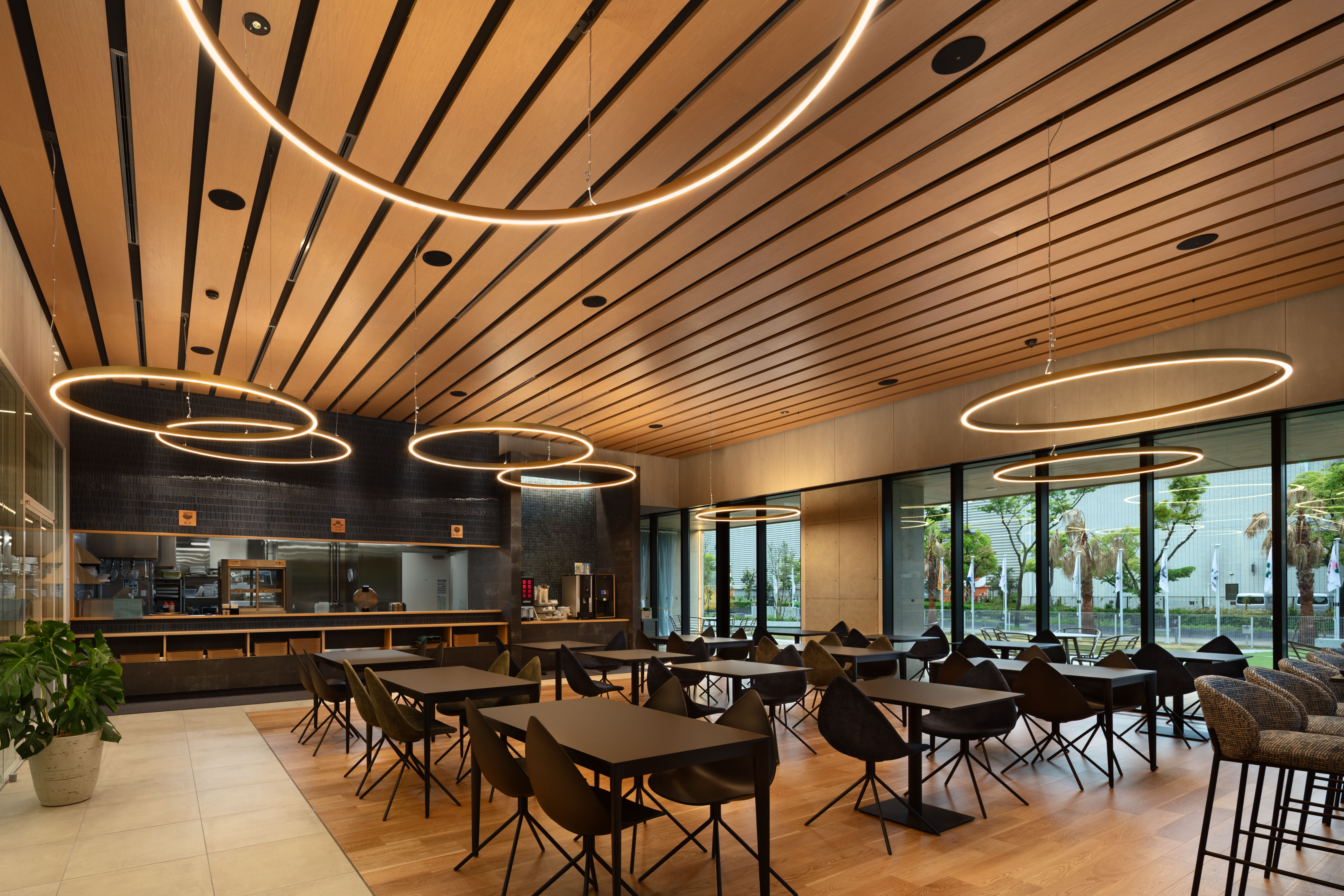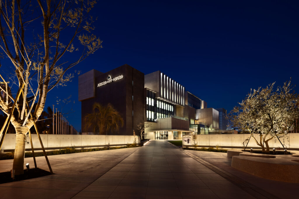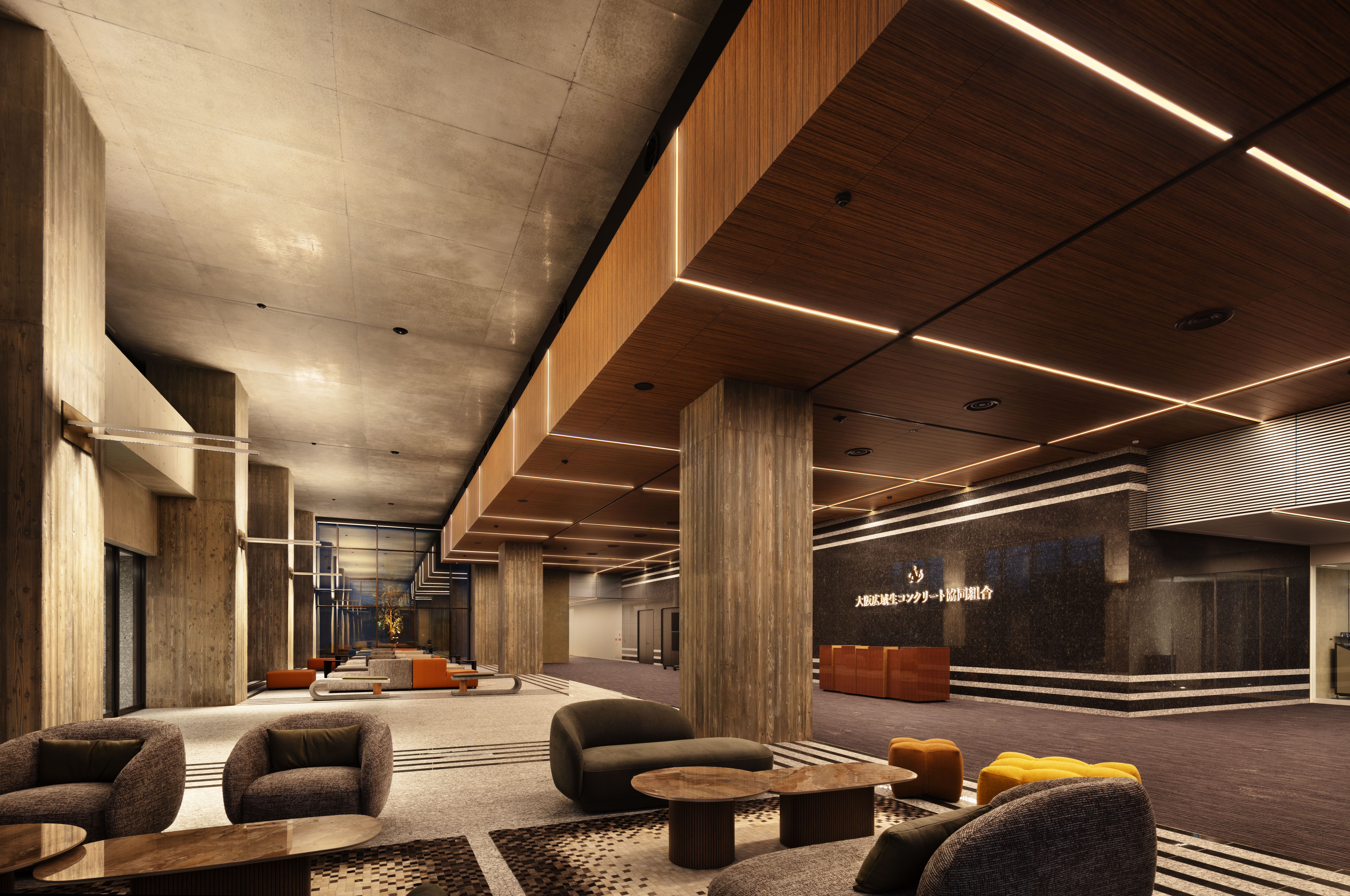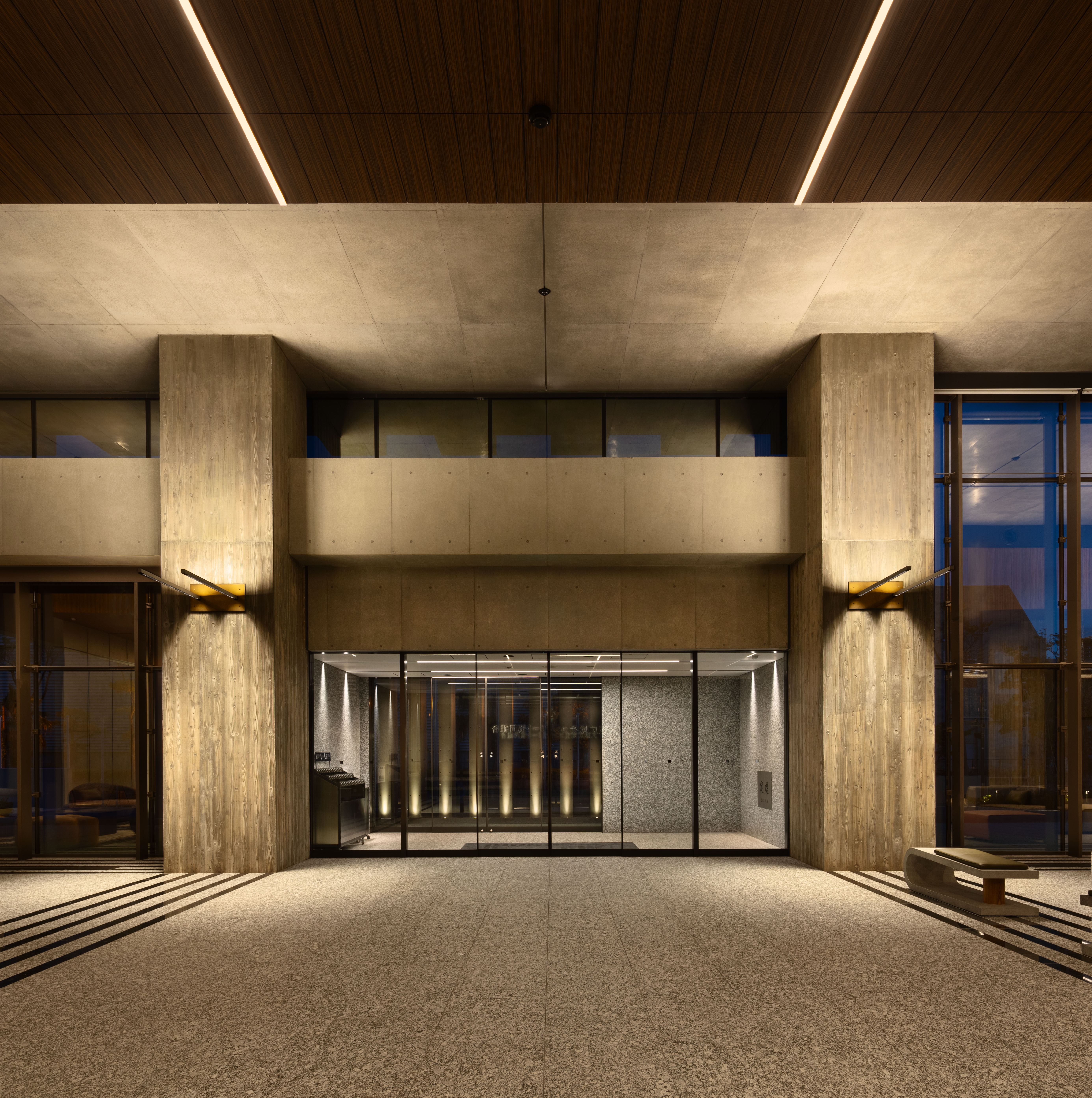 全国で300以上ある生コンクリート協同組合の中で最大規模を誇る、大阪広域生コンクリート協同組合。近畿一円に広く生コンを共同販売する同組合は、新たな本部オフィスおよび研究開発拠点として「テクノ・ラボ大阪」を新設、2025年3月に工事が完了、4月から通常営業を開始しました。梓設計様による施設建物は、同組合のほか関係団体が入居する事務所棟と、産官学が連携して生コンの最先端技術を研究開発する研究棟が一体となった構造で、生コン業界のシンボルとなる意匠と機能を実現しています。YAMAGIWAは、照明計画を担当したAZU設計工房様と協働、緻密な現場フォローにより、パブリックエリアだけでなく、ファサードのフルカラーライトアップ、事務所棟のオフィスライティングなど、外構を含め全エリアに照明器具を納入しています。