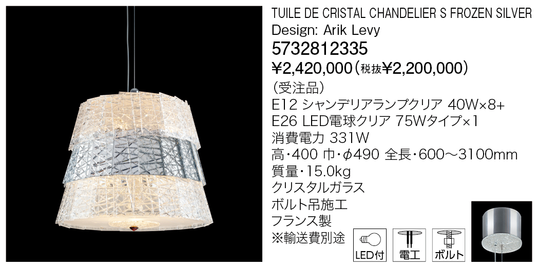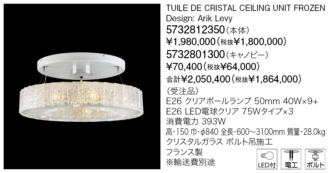 Result 検索結果 商品カテゴリー検索 シャンデリア 検索結果:102件 現在選択中の条件 商品カテゴリー: インドア-シャンデリア 材質: ガラス 商品カテゴリー 商品カテゴリー 選択して下さい インドア-ペンダント インドア-シーリング インドア-シャンデリア インドア-ブラケット インドア-スタンドライト インドア-システムライト アウトドア-屋外ダウンライト・シーリング アウトドア-屋外ブラケット アウトドア-屋外フットライト アウトドア-屋外スポットライト アウトドア-屋外地中埋設照明 アウトドア-屋外ボラード さらに絞り込む ブランド ブランド 選択して下さい YAMAGIWA ASTEP(アステップ/デンマーク) Baccarat(バカラ/フランス) B.C. SAN MICHELE(BC サン・ミッシェル/イタリア) ITALAMP(イタランプ/イタリア) Manooi(マノーイ/ハンガリー) PRECIOSA(プレシオーサ/チェコ) VENINI(ヴェニーニ/イタリア) 商品タイプ ベース デコラティブ 和風 吸音 システムライト タスクライト テーブルライト フロアライト ベースライト アジャスタブル ウォールウォッシャー アクセサリー スポットライト ペンダントライト アームライト ミュージアム メディカル 吊り下げ 直付け 防湿/防雨防湿 オプション/パーツ類 畳数 10~12畳 4.5畳 4.5~6畳 6~8畳 8~10畳 ~12畳 ~4.5畳 ~6畳 ~8畳 ~10畳 光源タイプ LED一体型 LED電球 その他 白熱球 色温度 電球色2200K 電球色2350K 電球色3500K 電球色2700K 電球色3000K 温白色3500K 白色4000K 昼白色5000K 昼光色6500K 調色 カラー その他 器具光束 500ℓm以下 501~1500ℓm 1501~3000ℓm 3001ℓm以上 取付方法 取付簡易型 引掛シーリング ライティングダクト 工事 フランジ・直付 ジャックイン 材質 選択中 金属 樹脂 木 布 ガラス 磁器 和紙 その他 取付条件 傾斜天井可 照明データ 0 3D CADデータ IESデータ REVITデータ 配光データ 選択項目をすべて解除 シャンデリア 検索結果:102件 投稿のページ送り Prev 1 … 8 9 10 11 Next 投稿のページ送り 1 … 8 9 10 11 表示順 : 型番順 価格が安い順 価格が高い ページ内すべてを選択 選択を解除 チェックした項目をダウンロード 全て選択 小組画像 全て選択 仕様図 全て選択 取扱説明書 全て選択 姿図1 全て選択 姿図2 全て選択 配光データ 全て選択 IESデータ 全て選択 商品画像 全て選択 3D CAD 全て選択 REVITデータ 全て選択 LE ROI SOLEIL CHANDELIER 24L(カタログ非掲載) 5732810323 オープン価格 色温度 2700K この製品データを全て選択 小組画像 仕様図 取扱説明書 姿図1 姿図2 配光データ IESデータ 商品画像 3D CAD REVITデータ PARIS CHANDELIER 24L 5732811902+5732603042 税込 ¥15,457,200 (税抜 ¥14,052,000) この製品データを全て選択 小組画像 仕様図 取扱説明書 姿図1 姿図2 配光データ IESデータ 商品画像 3D CAD REVITデータ TUILE DE CRISTAL CHANDELIER M PICCADILLY(カタログ非掲載) 5732812310 オープン価格 色温度 2700K この製品データを全て選択 小組画像 仕様図 取扱説明書 姿図1 姿図2 配光データ IESデータ 商品画像 3D CAD REVITデータ TUILE DE CRISTAL CHANDELIER FROZEN S 5732812315 税込 ¥2,310,000 (税抜 ¥2,100,000) この製品データを全て選択 小組画像 仕様図 取扱説明書 姿図1 姿図2 配光データ IESデータ 商品画像 3D CAD REVITデータ TUILE DE CRISTAL CHANDELIER S FROZEN SILVER(カタログ非掲載) 5732812335 オープン価格 色温度 2700K この製品データを全て選択 小組画像 仕様図 取扱説明書 姿図1 姿図2 配光データ IESデータ 商品画像 3D CAD REVITデータ TUILE DE CRISTAL CEILING UNIT FROZEN(カタログ非掲載) 5732812350+5732801300 オープン価格 色温度 2700K この製品データを全て選択 小組画像 仕様図 取扱説明書 姿図1 姿図2 配光データ IESデータ 商品画像 3D CAD REVITデータ MILLE NUITS CHANDELIER OVAL 18L 5732814810 税込 ¥7,700,000 (税抜 ¥7,000,000) この製品データを全て選択 小組画像 仕様図 取扱説明書 姿図1 姿図2 配光データ IESデータ 商品画像 3D CAD REVITデータ TUILE DE CRISTAL CHANDELIER RECTANGULAR FROZEN M 5732815603 税込 ¥6,600,000 (税抜 ¥6,000,000) この製品データを全て選択 小組画像 仕様図 取扱説明書 姿図1 姿図2 配光データ IESデータ 商品画像 3D CAD REVITデータ TUILE DE CRISTAL CHANDELIER RECTANGULAR PICCADILLY S 5732815620 税込 ¥4,180,000 (税抜 ¥3,800,000) この製品データを全て選択 小組画像 仕様図 取扱説明書 姿図1 姿図2 配光データ IESデータ 商品画像 3D CAD REVITデータ RILLIA G1524 税込 ¥209,000 (税抜 ¥190,000) この製品データを全て選択 小組画像 仕様図 取扱説明書 姿図1 姿図2 配光データ IESデータ 商品画像 3D CAD REVITデータ ページ内すべてを選択 選択を解除 チェックした項目をダウンロード 投稿のページ送り Prev 1 … 8 9 10 11 Next 投稿のページ送り 1 … 8 9 10 11 Index