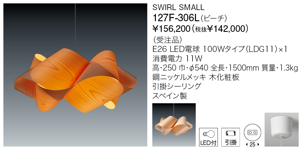 LZF(ルシフェル)社は、木材を薄い半透明のシート状に加工する特許技術Timberlite™を有しており、木の自然なままの美しさと品質を維持しつつ、非常に柔軟でありながら剛性のあるシートの特徴を生かして、数多くの照明を作り出しているブランドです。スワールは、平面のねじれから彫刻的な3次元フォームを作り出したペンダント照明。メビウスの輪のように、見る者の視線を引き付けて離さないデザインです。定番の木目調の色以外にも、グレーやペールローズなど他では味わえないカラーで多様なシーンにマッチします。