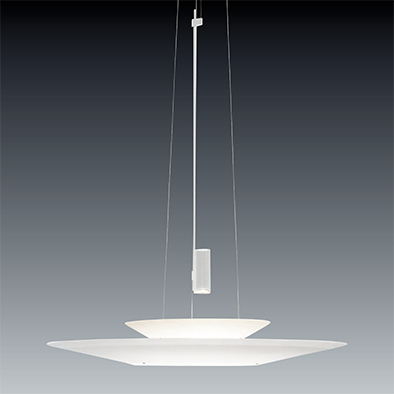 フラミンゴはセードで光源を覆うという照明の構造原理を疑い、光源とセードをあえて分離したペンダントライト。セードの中心を貫く支柱に配されたLEDは器具直下にスポットライトの明かりを届け、周囲にはセードが反射するやわらかな光を届けます。その姿は静かに水面に舞い降りるフラミンゴを彷彿とさせます。