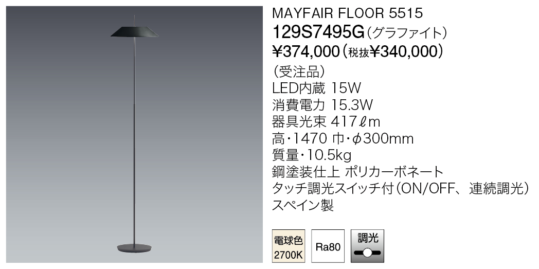 古典的な形状のランプを現代的な素材や質感・LED光源を用いて革新的にアプローチしたのがメイフェアです。セード内側の凹凸感による陰影や、綿密に設計された光源からの配光、タッチセンサー式調光スイッチによる滑らかな操作感などはクセの無い形状の中に技術や想いが詰まったVIBIAのデザインへのこだわりを強く感じ、空間をワンランク上質に仕上げます。