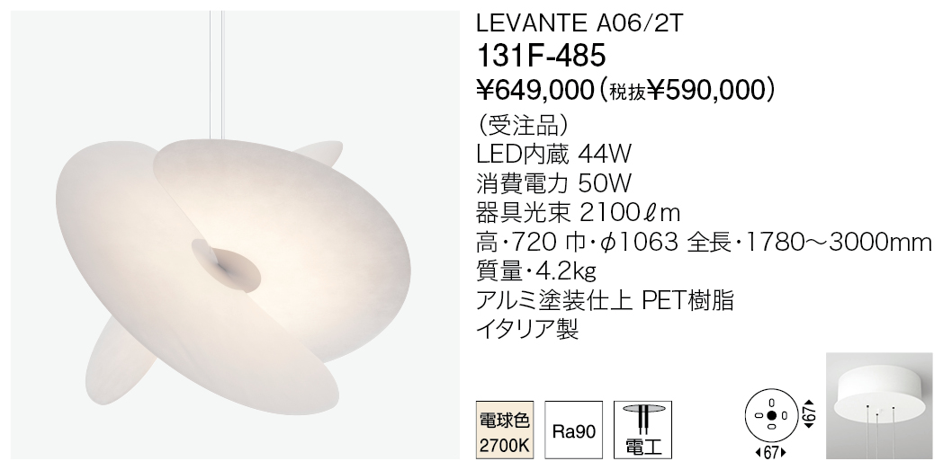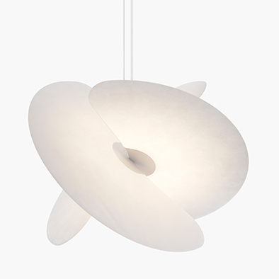 3つの大きな羽が交差したユニークな形状のレヴァンテは、軽やかなPET素材から構成されており、やわらかく幻想的な光のオブジェのように浮遊します。光源部は取り替え可能なため、寿命に制限されずに長く使用できます。輸送エネルギー削減の為、コンパクト梱包が採用された商品です。