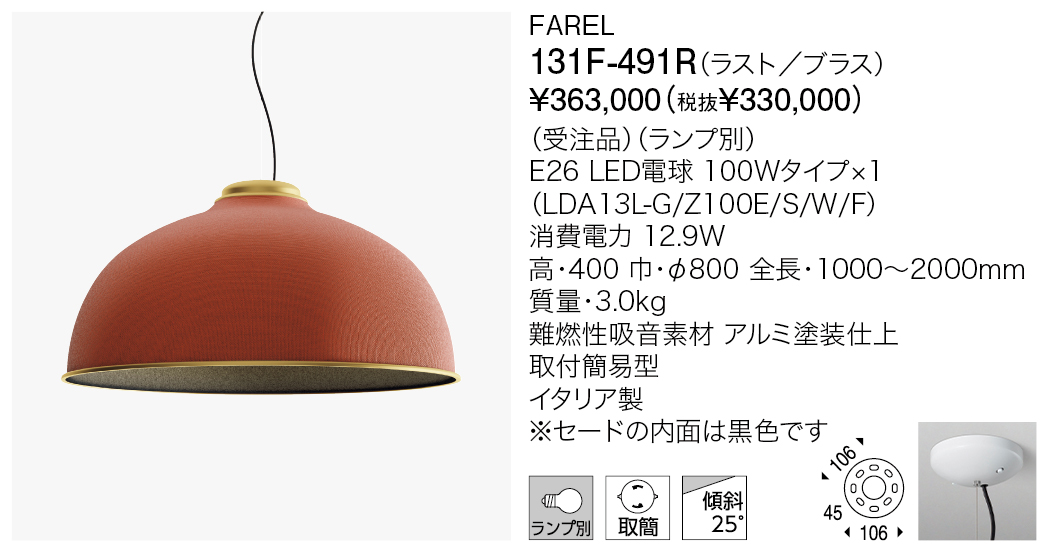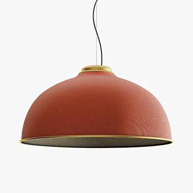アイコニックなドーム型ペンダントのファレル。ファブリック×メタルの組み合わせで構成され、落ち着いたグレー色をはじめ多彩なカラーラインナップにより様々なインテリアシーンに採用できます。多層素材のファブリックによるセードは吸音効果が期待できるだけでなく、特にオーカー色は海洋ごみから生成された素材を使用するなど、新たな視点で環境に配慮された商品です。