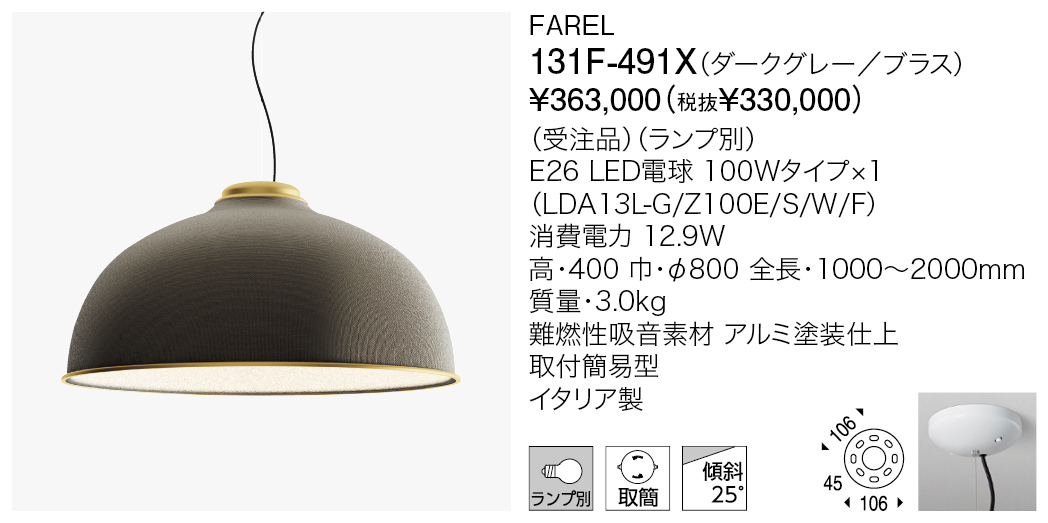 アイコニックなドーム型ペンダントのファレル。ファブリック×メタルの組み合わせで構成され、落ち着いたグレー色をはじめ多彩なカラーラインナップにより様々なインテリアシーンに採用できます。多層素材のファブリックによるセードは吸音効果が期待できるだけでなく、特にオーカー色は海洋ごみから生成された素材を使用するなど、新たな視点で環境に配慮された商品です。