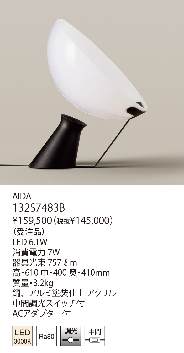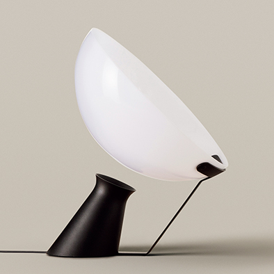 1988年にマンジャロッティが発表したアイーダは、重力に逆らうように固定されたシェードを離れた位置から光源で灯す構造です。重量感の中にある極めて繊細なバランス感や、素材の特性への徹底した追及など、彼のデザイン理念に触れることが出来る作品です。イタリアンプロダクトデザインのマスターピースの一つです。