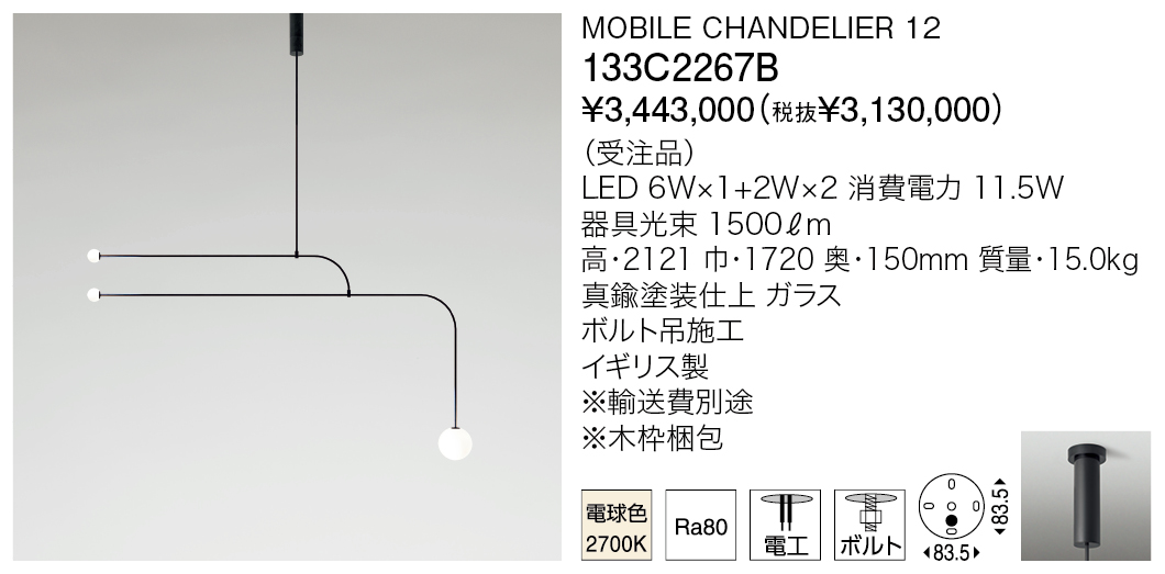 アレクサンダー・カルダーによる動く彫刻=モビールからインスパイアされた、マイケル・アナスタシアデスの代表作とも呼べる照明。連結部が自由にそして繊細に可動・回転し、空間の中で絶えず特有の表情が変化する様はまさに動く照明アート。ロンドンのスタジオでハンドメイドにより作られます。