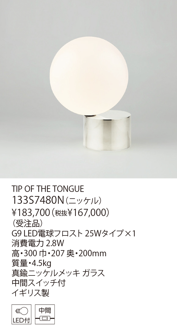 ティップオブザタングは、手吹きオパールガラスが真鍮製のベース端部に位置し、今にも転がり落ちてしまいそうな瞬間を切り取った様を表しています。プリミティブな素材とフォルムの組み合わせで様々な印象を作り上げるのも、マイケル・アナスタシアデスの特徴です。