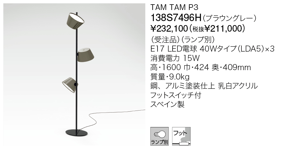 名前の由来でもあるドラム楽器をイメージしたタムタム。リズム感を光で演出してくれる遊び心に富んだ作品です。セードはそれぞれ自由な角度で調整できるため、空間全体を照らす事が可能です。セードのカラーは規定パターン以外も、指定色による自由な組み合わせに対応しています。