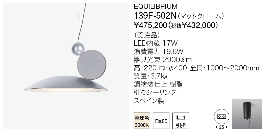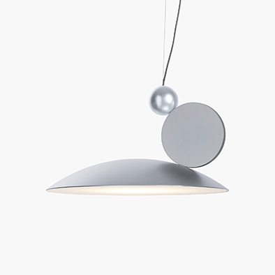 エクイリブリウム=均衡がデザインコンセプトのペンダント照明。このテーマに遊び心を持って取り組み、シンプルな円の基本形を用いて不思議なバランスを実現しています。LEDの光はフラットなディフューザーで柔らかく拡散され、眩しさを軽減しています。日常的に使う照明にアート作品のようなスパイスをきかせた作品です。