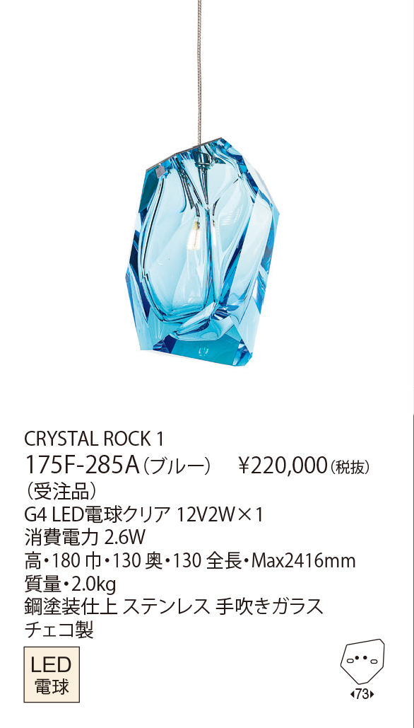 クリスタルの原石をイメージした、大胆なカットのクリスタルブロックによるLEDペンダント照明です。色鮮やかなクリスタルは、宙に漂う光の彫刻のようです。