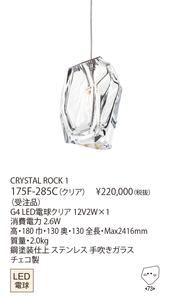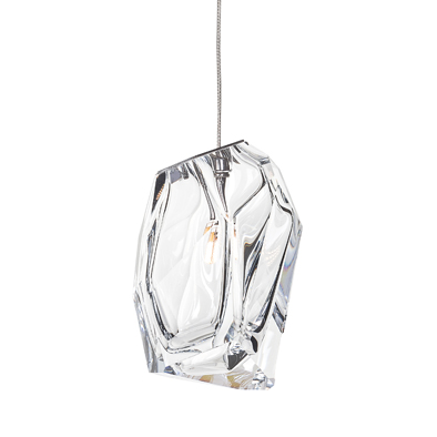 クリスタルの原石をイメージした、大胆なカットのクリスタルブロックによるLEDペンダント照明です。色鮮やかなクリスタルは、宙に漂う光の彫刻のようです。