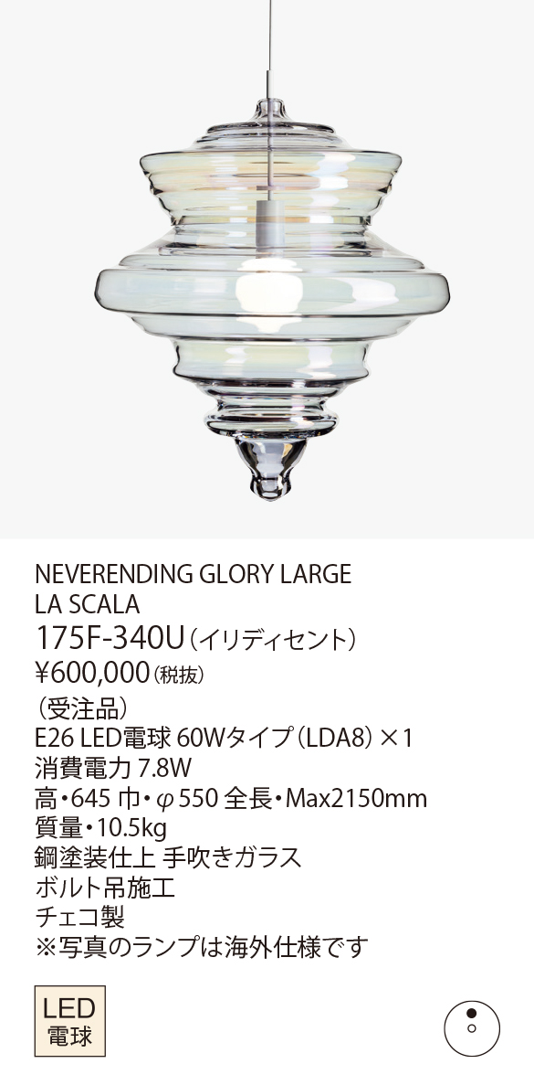 ネバーエンディンググローリーは、ノスタルジックな感情を反映するとともに、豪華な蝋燭のシャンデリアを新たな見方で解釈した作品です。そのフォルムは、世界で最も有名な5つのコンサートホールや劇場である、パリのガルニエ宮殿、ミラノのスカラ座、ニューヨークのメトロポリタン歌劇場、モスクワのボリショイ劇場、プラハのエステート劇場にあるシャンデリアのアウトラインを形どっています。