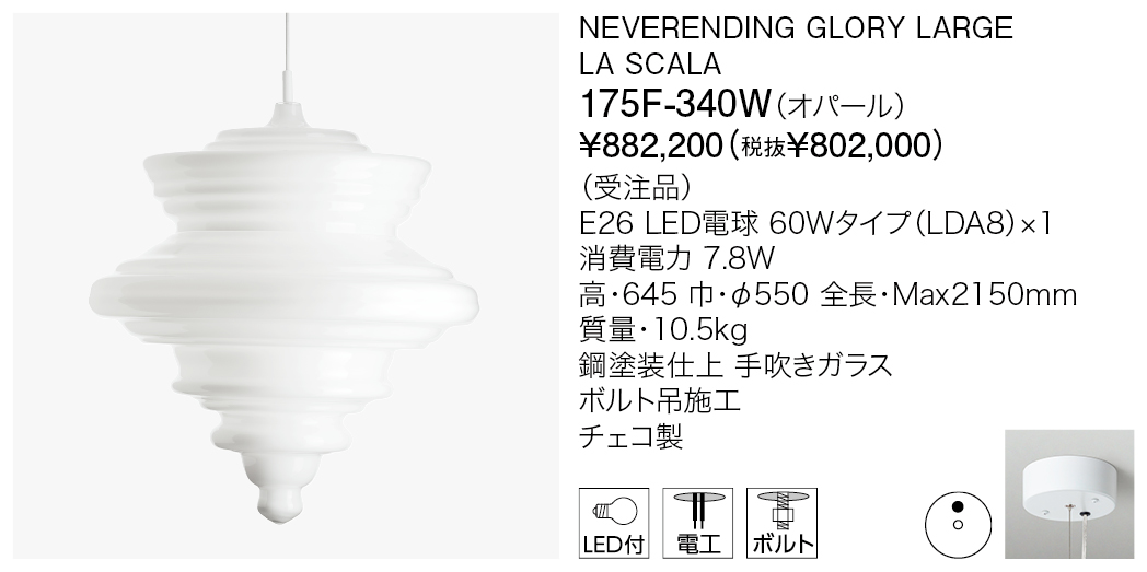 ネバーエンディンググローリーは、ノスタルジックな感情を反映するとともに、豪華な蝋燭のシャンデリアを新たな見方で解釈した作品です。そのフォルムは、世界で最も有名な5つのコンサートホールや劇場である、パリのガルニエ宮殿、ミラノのスカラ座、ニューヨークのメトロポリタン歌劇場、モスクワのボリショイ劇場、プラハのエステート劇場にあるシャンデリアのアウトラインを形どっています。