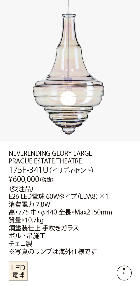 ネバーエンディンググローリーは、ノスタルジックな感情を反映するとともに、豪華な蝋燭のシャンデリアを新たな見方で解釈した作品です。そのフォルムは、世界で最も有名な5つのコンサートホールや劇場である、パリのガルニエ宮殿、ミラノのスカラ座、ニューヨークのメトロポリタン歌劇場、モスクワのボリショイ劇場、プラハのエステート劇場にあるシャンデリアのアウトラインを形どっています。
