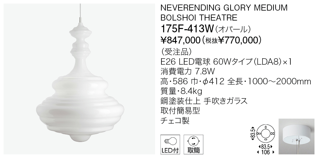 ネバーエンディンググローリーは、ノスタルジックな感情を反映するとともに、豪華な蝋燭のシャンデリアを新たな見方で解釈した作品です。そのフォルムは、世界で最も有名な5つのコンサートホールや劇場である、パリのガルニエ宮殿、ミラノのスカラ座、ニューヨークのメトロポリタン歌劇場、モスクワのポリショイ劇場、プラハのエステート劇場にあるシャンデリアのアウトラインを形どっています。