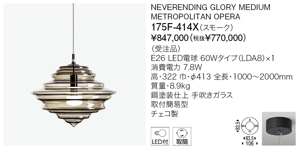 ネバーエンディンググローリーは、ノスタルジックな感情を反映するとともに、豪華な蝋燭のシャンデリアを新たな見方で解釈した作品です。そのフォルムは、世界で最も有名な5つのコンサートホールや劇場である、パリのガルニエ宮殿、ミラノのスカラ座、ニューヨークのメトロポリタン歌劇場、モスクワのポリショイ劇場、プラハのエステート劇場にあるシャンデリアのアウトラインを形どっています。