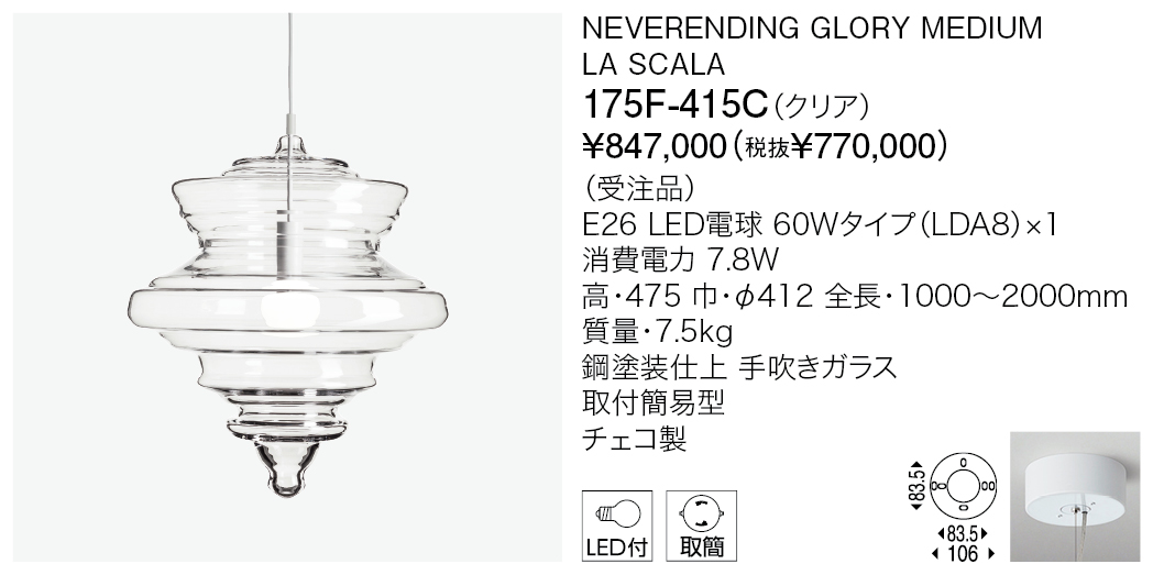ネバーエンディンググローリーは、ノスタルジックな感情を反映するとともに、豪華な蝋燭のシャンデリアを新たな見方で解釈した作品です。そのフォルムは、世界で最も有名な5つのコンサートホールや劇場である、パリのガルニエ宮殿、ミラノのスカラ座、ニューヨークのメトロポリタン歌劇場、モスクワのポリショイ劇場、プラハのエステート劇場にあるシャンデリアのアウトラインを形どっています。