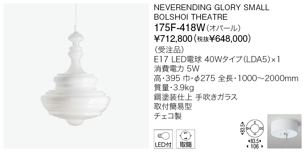ネバーエンディンググローリーは、ノスタルジックな感情を反映するとともに、豪華な蝋燭のシャンデリアを新たな見方で解釈した作品です。そのフォルムは、世界で最も有名な5つのコンサートホールや劇場である、パリのガルニエ宮殿、ミラノのスカラ座、ニューヨークのメトロポリタン歌劇場、モスクワのポリショイ劇場、プラハのエステート劇場にあるシャンデリアのアウトラインを形どっています。