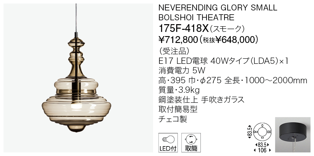 ネバーエンディンググローリーは、ノスタルジックな感情を反映するとともに、豪華な蝋燭のシャンデリアを新たな見方で解釈した作品です。そのフォルムは、世界で最も有名な5つのコンサートホールや劇場である、パリのガルニエ宮殿、ミラノのスカラ座、ニューヨークのメトロポリタン歌劇場、モスクワのポリショイ劇場、プラハのエステート劇場にあるシャンデリアのアウトラインを形どっています。