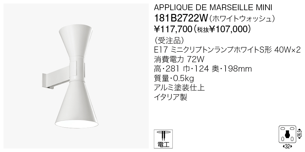 ル・コルビュジエがパリのヌンゲセール・エ・コリ通りの自邸のためにデザインしたアプリーク・ドゥ・マルセイユ。そぎ落とされたシンプルな2つのランプシェードが背中合わせとなり、上下に均質でシャープな光をもたらします。日本の住宅空間などでも使用しやすいサイズ感のミニバージョンが登場しました。