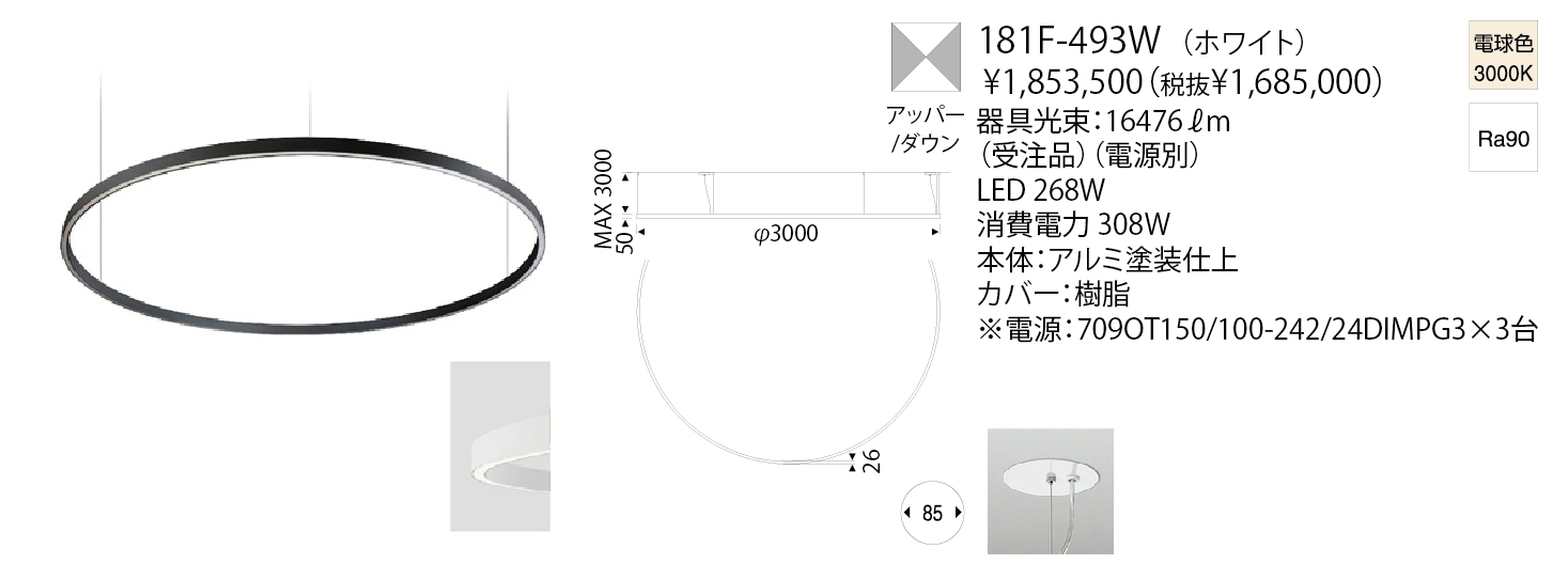 大型LEDリングシリーズのジルコル。φ2000mmを中心とした豊富なサイズと形状のバリエーションや、高級感のある本体仕上が特徴的な建築照明です。巾26mmのスリムな本体ながら上下配光の光源設計により天井面にも充分な明るさを届け、正円タイプはオープンエリア、楕円タイプはミーティングステーブルなどに均質な光を届けるベース照明として最適な提案をもたらします。