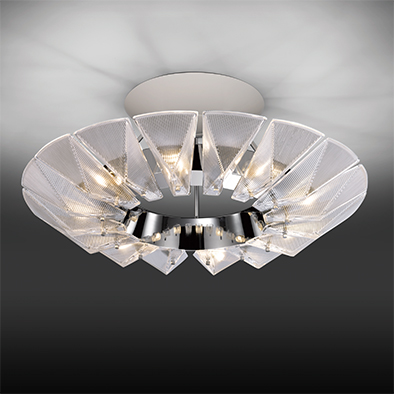 フィオーレは、内側にプリズムカットしたクリアのプレスガラスをリング状に並べたデザインが特徴です。折り紙のようなシャープなエッジラインが連続し、煌き感のあるモダンなシャンデリアです。