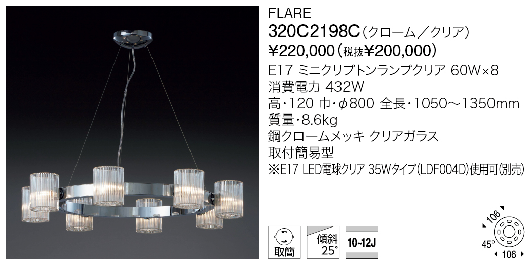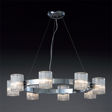 フレアは、10世紀頃に教会を中心として発達したクラシックシャンデリアの一つ、リングの周りに蝋燭を配したロマネスク様式をモダンに解釈したシャンデリア。独特の味わいがあるプレスガラス製のセードを通る光は、空間に重厚な輝きを放ちます。リング本体はクローム、ホワイト、ブラスの3種類、ガラスはクリアとホワイトの2種類を用意。豊富なバリエーションからインテリアのスタイルに合わせて選べます。