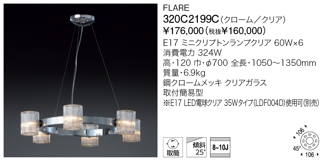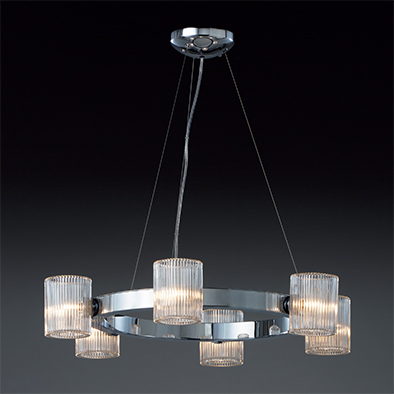 フレアは、10世紀頃に教会を中心として発達したクラシックシャンデリアの一つ、リングの周りに蝋燭を配したロマネスク様式をモダンに解釈したシャンデリア。独特の味わいがあるプレスガラス製のセードを通る光は、空間に重厚な輝きを放ちます。リング本体はクローム、ホワイト、ブラスの3種類、ガラスはクリアとホワイトの2種類を用意。豊富なバリエーションからインテリアのスタイルに合わせて選べます。