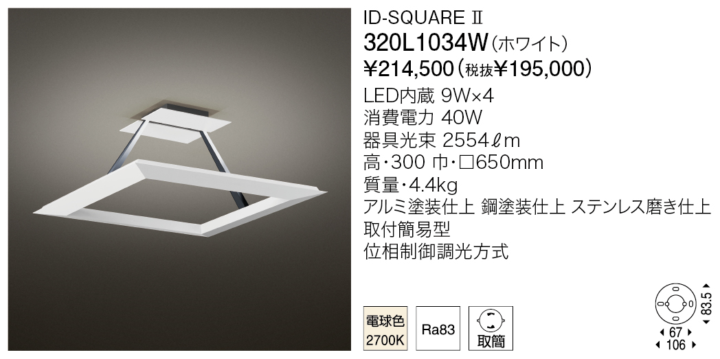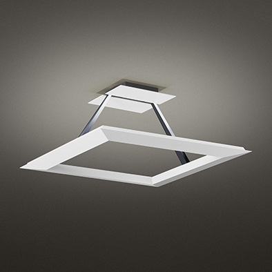 ID-SQUAREは、天井への間接照明を手軽に演出することができるシリーズです。ID-SQUARE Ⅱは、白いアルミフレームが軽快なモデル。鏡面仕上げを施した2本のアームには周囲が映り込み、天井への柔らかい光の中、スクエアの枠のみ浮いているかのような感覚を覚えます。