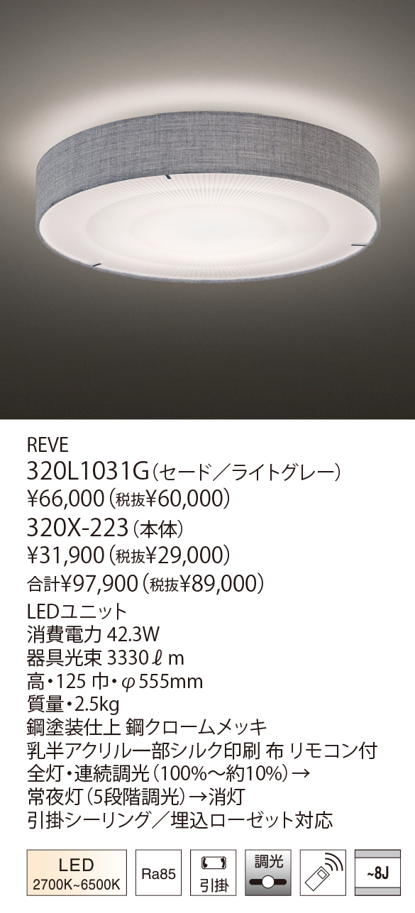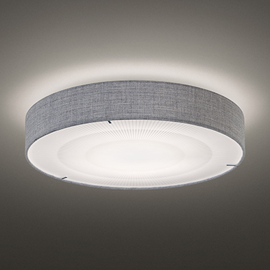 レーヴは、デンマークを代表するテキスタイルブランド クヴァドラ社のRemix2を採用したシンプルで上品なシーリングライト。テキスタイルを透過する側面からのやわらかな光と、下面アクリルを通す均一で明るい光が室内を豊かに満たします。薄型設計で圧迫感が無く、リビングだけでなく個室にも最適。寝室では、リモコンによる調光・調色機能で良質な眠りへと導きます。