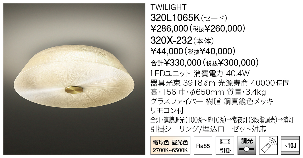 トワイライトは薄明や薄暮を意味し、水平線に日が沈む黄昏時の空の色合いを表現した照明器具です。上空の大気が太陽光を散乱することで起きる現象を、紡がれたセードの繊維1本1本に光を散乱させることで表現しており、柔らかい光のグラデーションを作ります。