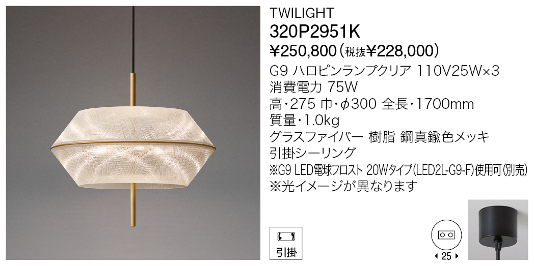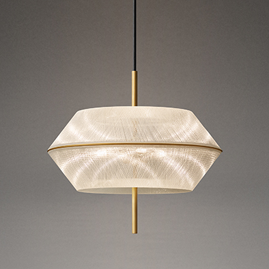 トワイライトは薄明や薄暮を意味し、水平線に日が沈む黄昏時の空の色合いを表現した照明器具です。布のようなセードはガラス繊維によって成型されており、上空の大気が太陽光を散乱することで起きる現象を、紡がれたセードの繊維1本1本に光を散乱させることで表現しています。ランプの光がセードを通して幾重にも広がることによって生まれるクリスタルシャンデリアのような輝きと、夕日のように暖かな色合いが特徴です。
