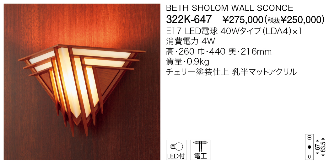 ベス・ショーロムウォールスコンスは、ペンシルベニア州のベス・ショーロム教会にあるブラケットのデザインを基にした照明器具。オリジナルデザインを活かしながらも日本の空間に合わせて素材を金属から木に変え、スケールダウンしています。