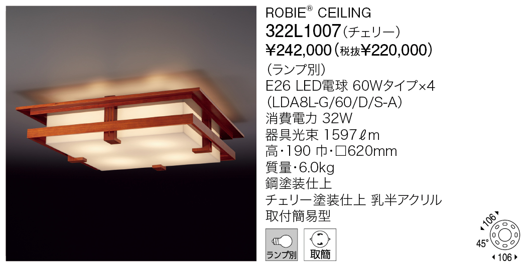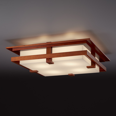 ロビーシーリングは、フランク・ロイド・ライトによる住宅建築、フレデリック・ロビー邸(1908年シカゴ)のリビングルームのためにデザインされたブラケットライトのデザインエッセンスを取り入れたシーリングライトです。水平線を強調したフレームデザインは、初期の建築様式であるプレイリースタイル(草原様式)を彷彿とさせます。
