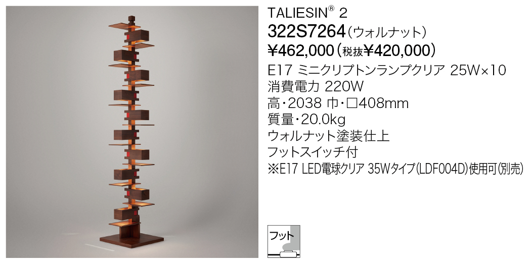 フランク・ロイド・ライトは間接光の美しさに魅了され、自身が設計した米国ウィスコンシン州のタリアセンの劇場のために木製のボックスと遮光板で構成したペンダント照明をデザインしました。それ以来、さまざまな空間にあわせて光の彫刻のように同様のデザインを応用しました。YAMAGIWAは1994年より照明器具の製造販売に関する独占ライセンス契約を締結し12の製品を復刻しました。タリアセン2は12種の初期復刻器具の一つ。ライトは特にタリアセン2を気に入っており、自身の書斎にも使用していました。タリアセン3とタリアセン4は、日本の住宅での使用を想定して制作したシリーズです。