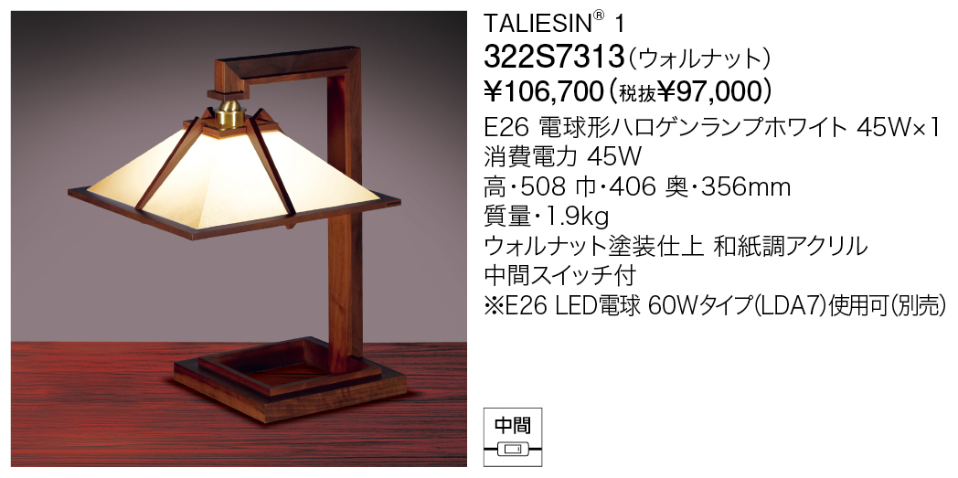 タリアセン1は、ウィスコンシン州、スプリング・グリーン、タリアセンにあるフランク・ロイド・ライトの夏の家のためにデザインされた照明器具です。ライトの建築造形形態のひとつである方形屋根がデザインに取り入れられ、まるでタリアセン内部に小さな建物があるかのように見えます。この照明器具はライトのクライアントにも気に入られ、以降彼の設計した住宅でもしばしば使用されることになりました。