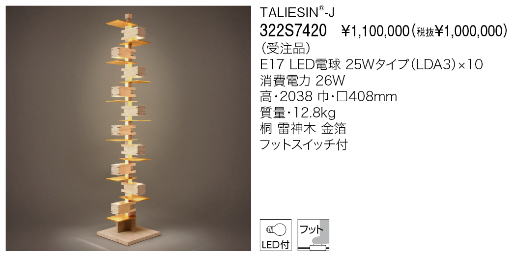ライトは日本との関わりが深く、帝国ホテルや自由学園明日館の設計など、彼の建築には日本の文化や技術の影響が多分に伺える。タリアセンを日本的に表現することで、ライトの世界観の深度が増すのではないかと考え、会津桐と金沢箔という日本ならではの素材を採用した。桐がもつ絹のような光沢と箔のもつ品格ある輝きは、華やかな中にも奥ゆかしさを感じさせ、日本の美とライトの普遍的なエッセンスとが調和した。- 橋本 夕紀夫