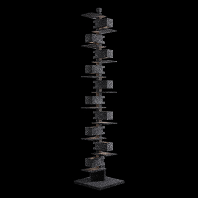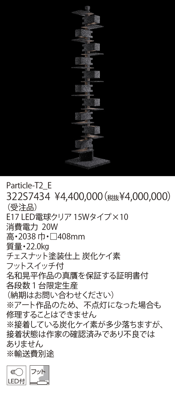 すべての物質は粒子(Particle)で出来ている ー 光を反射する炭化ケイ素でモチーフを覆い、鉱物的で武骨なテクスチャーから生まれる繊細で複雑な煌きは、光の粒子が集まりボリュームを構成する様を表している。ライトのタリアセンがそうであったように、空間のスケールに合わせられるよう高さのバリエーションを揃えた。積み重なるエレメントは地面から立ち上がる生命のようであり、無限柱のような永遠性をも想起させる。- 名和 晃平