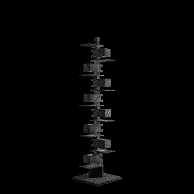 すべての物質は粒子(Particle)で出来ている ー 光を反射する炭化ケイ素でモチーフを覆い、鉱物的で武骨なテクスチャーから生まれる繊細で複雑な煌きは、光の粒子が集まりボリュームを構成する様を表している。ライトのタリアセンがそうであったように、空間のスケールに合わせられるよう高さのバリエーションを揃えた。積み重なるエレメントは地面から立ち上がる生命のようであり、無限柱のような永遠性をも想起させる。- 名和 晃平