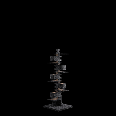 すべての物質は粒子(Particle)で出来ている ー 光を反射する炭化ケイ素でモチーフを覆い、鉱物的で武骨なテクスチャーから生まれる繊細で複雑な煌きは、光の粒子が集まりボリュームを構成する様を表している。ライトのタリアセンがそうであったように、空間のスケールに合わせられるよう高さのバリエーションを揃えた。積み重なるエレメントは地面から立ち上がる生命のようであり、無限柱のような永遠性をも想起させる。- 名和 晃平