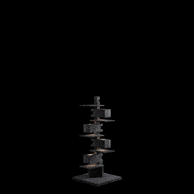 すべての物質は粒子(Particle)で出来ている ー 光を反射する炭化ケイ素でモチーフを覆い、鉱物的で武骨なテクスチャーから生まれる繊細で複雑な煌きは、光の粒子が集まりボリュームを構成する様を表している。ライトのタリアセンがそうであったように、空間のスケールに合わせられるよう高さのバリエーションを揃えた。積み重なるエレメントは地面から立ち上がる生命のようであり、無限柱のような永遠性をも想起させる。- 名和 晃平