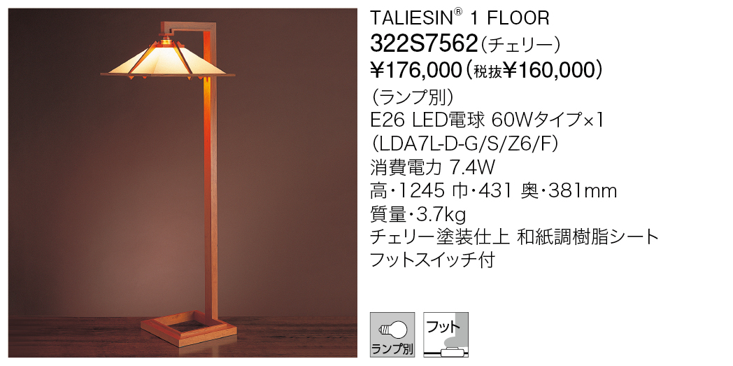 タリアセン1は、ウィスコンシン州、スプリング・グリーン、タリアセンにあるフランク・ロイド・ライトの夏の家のためにデザインされた照明器具です。ライトの建築造形形態のひとつである方形屋根がデザインに取り入れられ、まるでタリアセン内部に小さな建物があるかのように見えます。この照明器具はライトのクライアントにも気に入られ、以降彼の設計した住宅でもしばしば使用されることになりました。