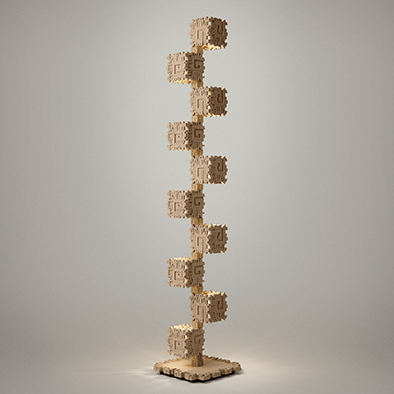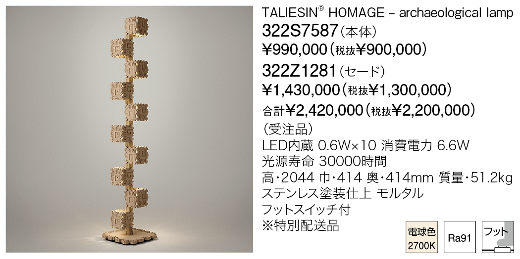考古学的な視点から、タリアセン2へのオマージュを構想した。フランク・ロイド・ライトがこの照明をデザインした当時、ライトはマヤ文明の古代遺跡に深いインスピレーションを抱き、多くの建築を生み出していた。その源流を考古学的に掘り下げ、オマージュにオマージュを重ねることから始めた。さらに、ライトが考案したテキスタイル・ブロック工法を考えることで、型枠によって一体成型されたブロックを垂直に積み上げることで、まるで古代遺跡のような照明が立ち上がる。その平板の表面に刻まれた凹凸が、光と影の陰影として共鳴し、古代の記憶と現代の光が折り重なることで、時空を超えた対話が生まれる。