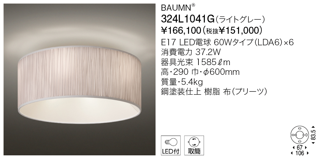 バウムは、細かいランダムプリーツの表情がシンプルな形状にマッチしたボリュームのある照明です。内側はすり鉢状にデザインされ、内部に仕込まれたランプから全体が発光します。光源が目に入らず、空間を温かく包み込みます。同シリーズのペンダント、スタンドと合わせてトータルコーディネートが可能です。