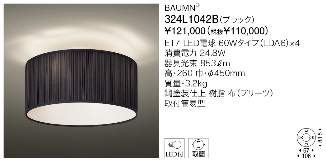バウムは、細かいランダムプリーツの表情がシンプルな形状にマッチしたボリュームのある照明です。内側はすり鉢状にデザインされ、内部に仕込まれたランプから全体が発光します。光源が目に入らず、空間を温かく包み込みます。同シリーズのペンダント、スタンドと合わせてトータルコーディネートが可能です。