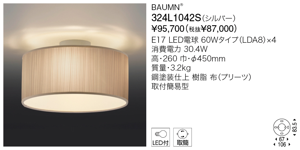 バウムは、細かいランダムプリーツの表情がシンプルな形状にマッチしたボリュームのある照明です。内側はすり鉢状にデザインされ、内部に仕込まれたランプから全体が発光します。光源が目に入らず、空間を温かく包み込みます。同シリーズのペンダント、スタンドと合わせてトータルコーディネートが可能です。バウムⅡはプリーツを採用したデザインです。プリーツの端面をリボンで縁取らずすっきりとしたモダンなディテールに仕上がっています。点灯するとプリーツがきれいに透けるモダンなデザインです。