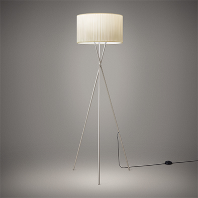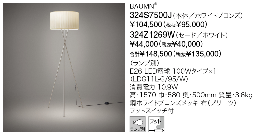 細かいランダムプリーツの上品なデザインと空間を温かく包み込む優しい光が特徴のロングセラー、バウムシリーズのフロアスタンドです。ホワイトブロンズ/ブラスの華奢な3本の脚がエレガントな雰囲気を一層引き立てます。