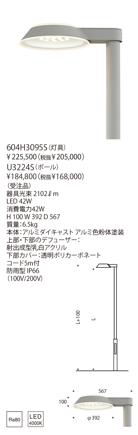 - 灯具:アルミダイキャスト アルミ色粉体塗装仕上 射出成型乳白アクリル 透明ポリカーボネイト