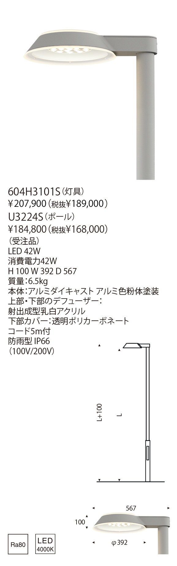 - 灯具:アルミダイキャスト アルミ色粉体塗装仕上 射出成型乳白アクリル 透明ポリカーボネイト